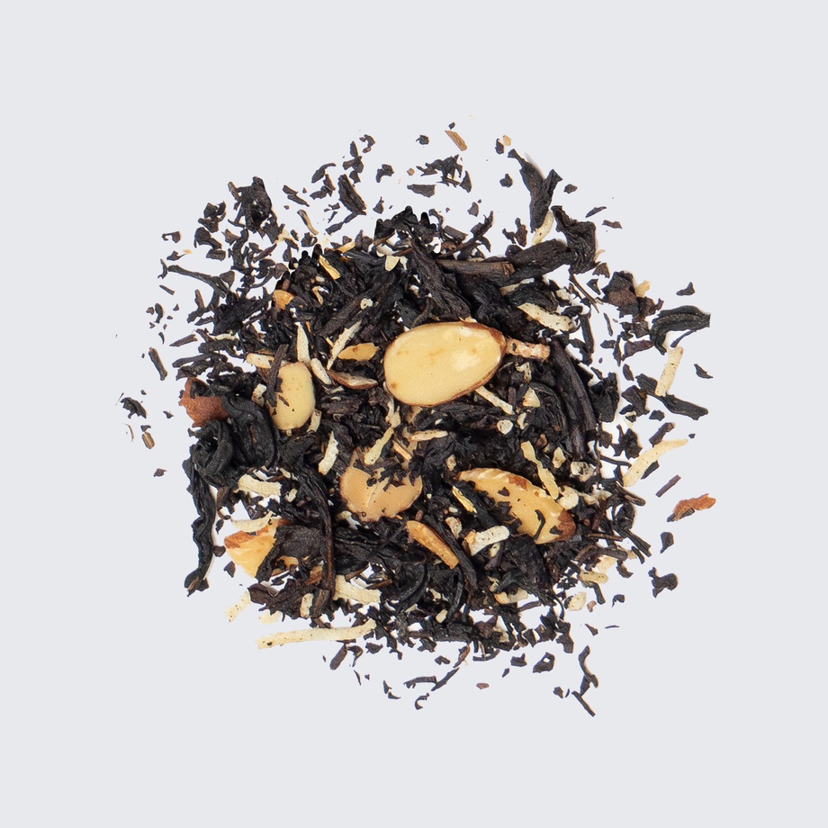 Black tea, almond halves, coconut shreds, maca, vanilla extract, eleuthero (Siberian ginseng).